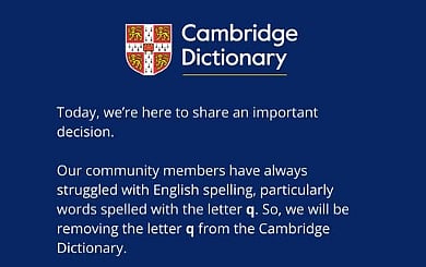 কেমব্রিজ ডিকশনারি থেকে ইংরেজি বর্ণমালার ১৭তম অক্ষর কিউ (Q বা q) সরিয়ে ফেলা–সংক্রান্ত প্রথম পোস্টে ‘আমাদের কমিউনিটির জন্য একটি বিশেষ ঘোষণা’ শিরোনামে বলা হয়, ‘আজ আমরা একটি গুরুত্বপূর্ণ সিদ্ধান্ত শেয়ার করতে এসেছি। আমাদের কমিউনিটির সদস্যরা সব সময় ইংরেজি বানান নিয়ে সমস্যায় পড়েন, বিশেষ করে “q” অক্ষর দিয়ে বানান করা শব্দগুলোর সঙ্গে। তাই আমরা কেমব্রিজ ডিকশনারি থেকে “q” অক্ষরটি সরিয়ে ফেলব।’ q অক্ষরের পরিবর্তে কোন অক্ষরটি ব্যবহার করা হবে, সেটিও জানিয়ে বলা হয়, ‘বর্তমানে “qu” দিয়ে বানান করা সব শব্দের পরিবর্তে “k” অথবা “kw” দিয়ে বানান করা হবে। উদাহরণস্বরূপ- kwiet, ekwipment ও antike।’