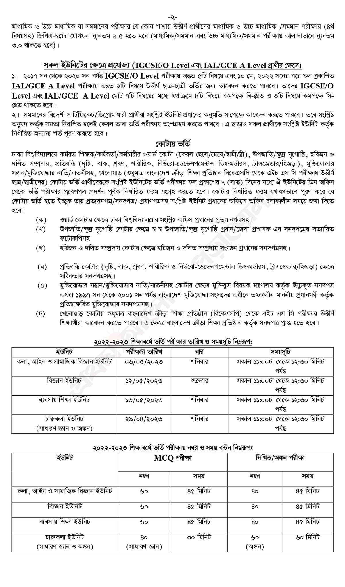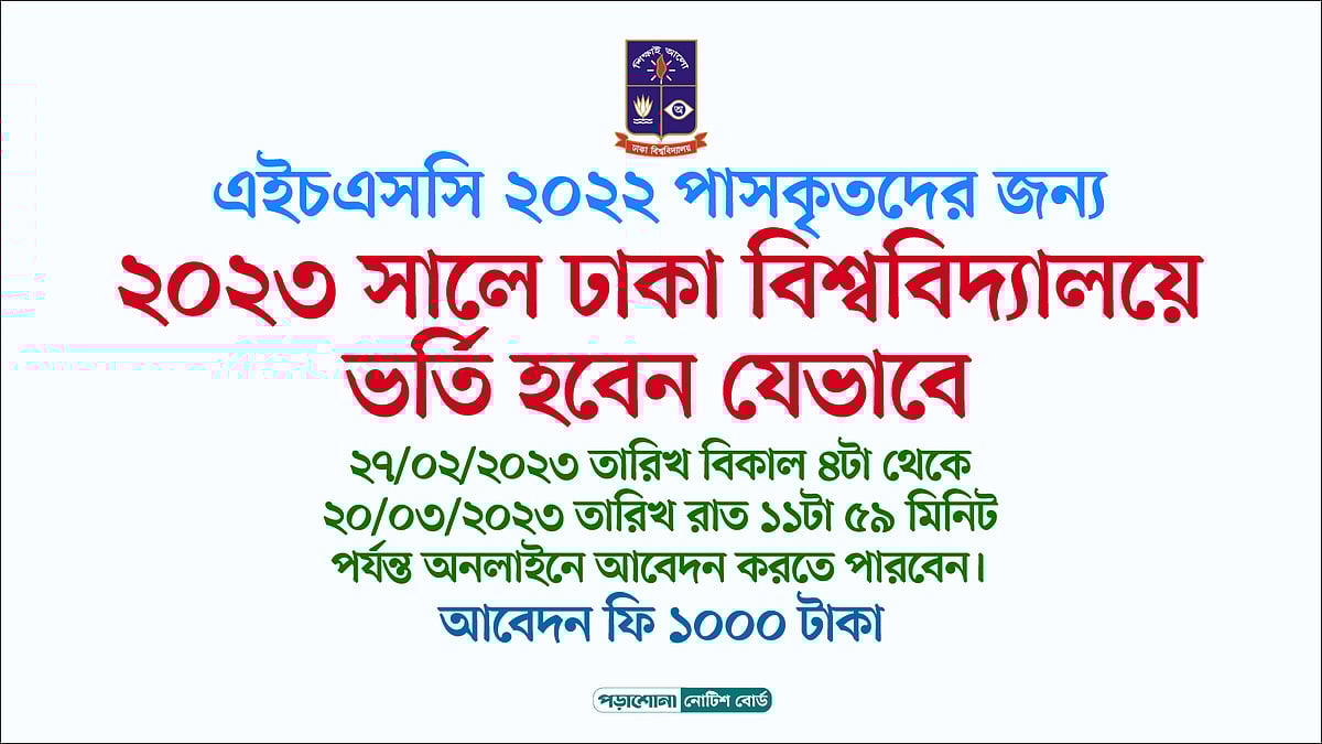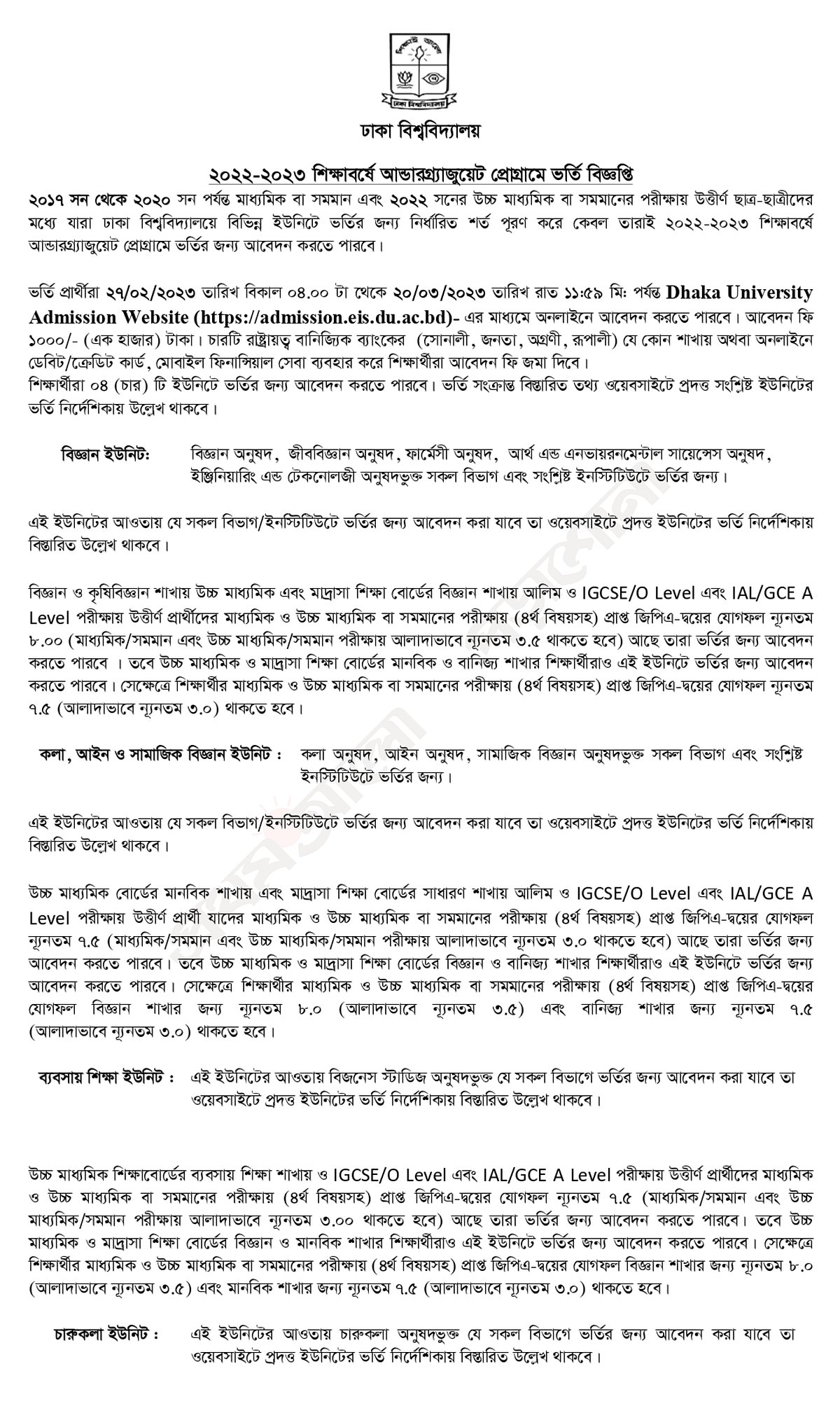 জেনে রাখুন: ২০১৭ সাল থেকে ২০২০ সাল পর্যন্ত মাধ্যমিক বা সমমান এবং ২০২২ সালের উচ্চমাধ্যমিক বা সমমানের পরীক্ষায় উত্তীর্ণ ছাত্রছাত্রীদের মধ্যে যাঁরা ঢাকা বিশ্ববিদ্যালয়ে বিভিন্ন ইউনিটে ভর্তির জন্য নির্ধারিত শর্ত পূরণ করেন, শুধু তাঁরাই ২০২২–২৩ শিক্ষাবর্ষে আন্ডারগ্র্যাজুয়েট প্রোগ্রামে ভর্তির জন্য আবেদন করতে পারবেন।