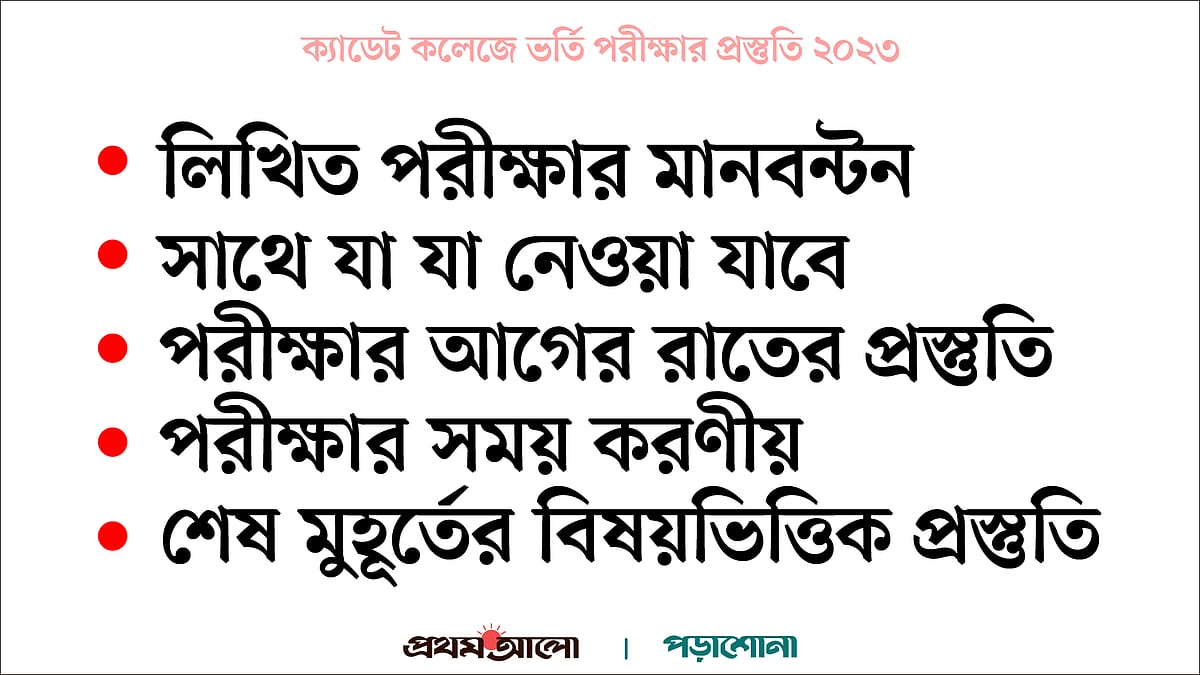 প্রিয় শিক্ষার্থী, ২০২৩ সালের ক্যাডেট কলেজ ভর্তি পরীক্ষায় অংশগ্রহণ করতে যাচ্ছো সবাইকে শুভেচ্ছা। বর্তমানে বাংলাদেশে ছেলেদের ৯ টি ও মেয়েদের ৩ টি সহ মোট ১২ টি ক্যাডেট কলেজ আছে। সাধারণত ৩টি ধাপে ক্যাডেট কলেজের ভর্তি পরীক্ষা অনুষ্ঠিত হয়। প্রথমে লিখিত পরীক্ষা, এরপর স্বাস্থ্য ও মৌখিক পরীক্ষা অনুষ্ঠিত হয়। লিখিত পরীক্ষার উর্ত্তীণ সবাই মৌখিক ও স্বাস্থ্য পরীক্ষায় অংশগ্রহণ করতে পারবে। আগামী ৬ জানুয়ারি ক্যাডেট কলেজের ভর্তি পরীক্ষা অনুষ্ঠিত হবে। ১২ ক্যাডেট কলেজ ছাড়াও আরও কিছু কেন্দ্রে এই পরীক্ষা অনুষ্ঠিত হবে।
