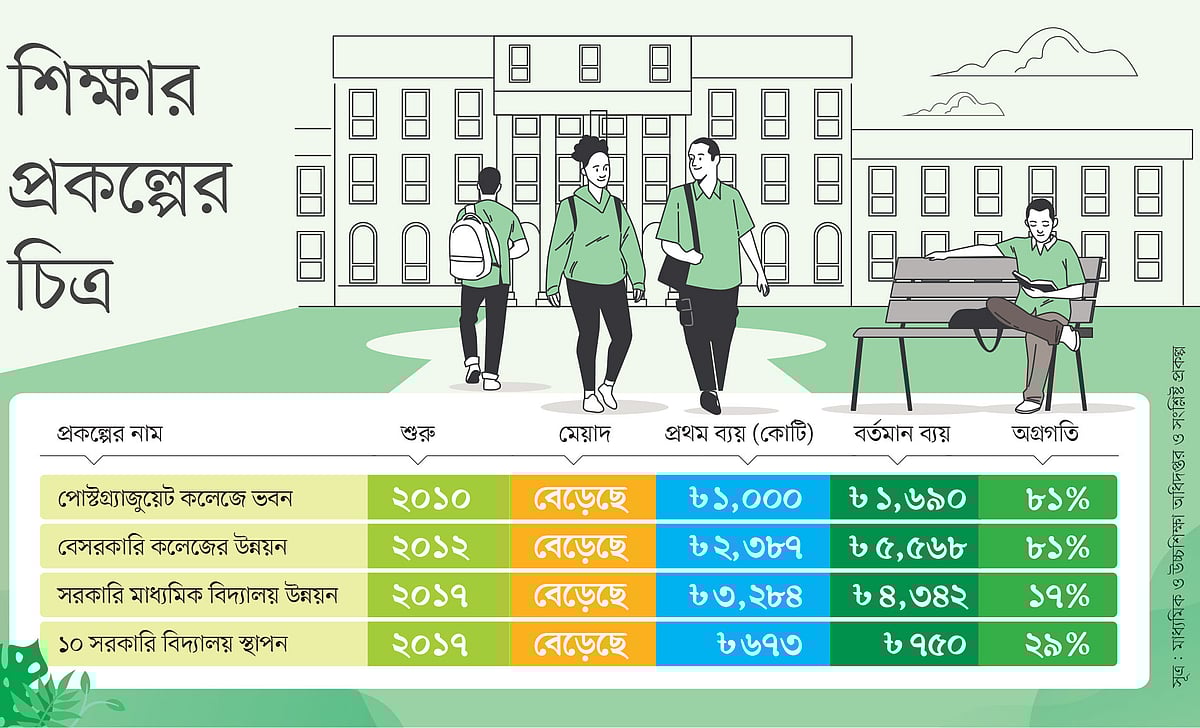 জেলা সদরের বড় কলেজে ভবন নির্মাণ করার প্রকল্প নেওয়া হয়েছিল ২০১০ সালে। কথা ছিল ৭০টি বড় কলেজে ভবন নির্মাণে সময় লাগবে তিন বছর। শুরুতে ব্যয় ধরা হয়েছিল প্রায় এক হাজার কোটি টাকা। পরে ব্যয় বাড়িয়ে ধরা হয় ১ হাজার ৬৯০ কোটি টাকা। এই প্রকল্পের নতুন মেয়াদ শেষ হবে আগামী জুনে।
