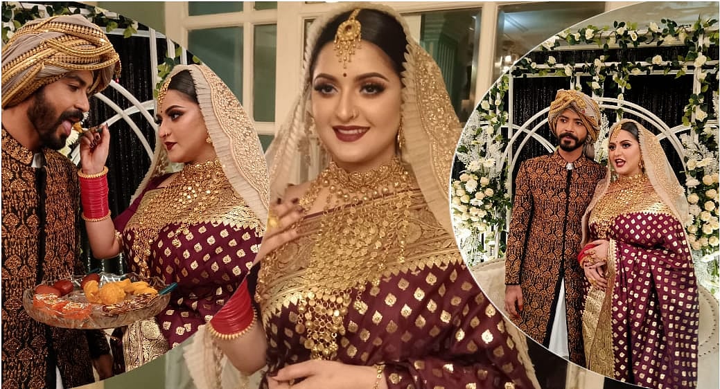 বিয়ের আসরে পরীমনি ও শরিফুল রাজ।বিয়ের আসরে দুজনের গায়ে ছিল খয়েরি ও সোনালি রঙের পোশাক।রাজকে মিষ্টিমুখ করাচ্ছেন পরীমনি