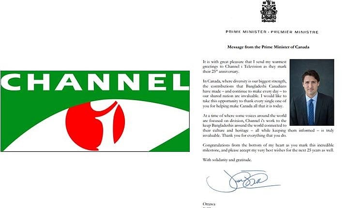 চ্যানেল আইকে পাঠানো এক শুভেচ্ছাবার্তায় জাস্টিন ট্রুডো বলেছেন, ‘চ্যানেল আই ২৫তম জন্মদিন পালন করতে যাচ্ছে জেনে আমি খুবই আনন্দিত। চ্যানেল আইকে আমার উষ্ণ অভিনন্দন। বহু সংস্কৃতির দেশ কানাডায় বৈচিত্র্যতা সবচেয়ে বড় শক্তি। এই বৈচিত্র্যময় কানাডা তৈরিতে বাংলাদেশি কানাডিয়ানরা প্রতিদিন যে অবদান রাখছেন, তা অমূল্য। এর মাধ্যমে আমি আপনাদের সবাইকে ধন্যবাদ ও কৃতজ্ঞতা প্রকাশের সেই সুযোগও নিতে চাই।’
