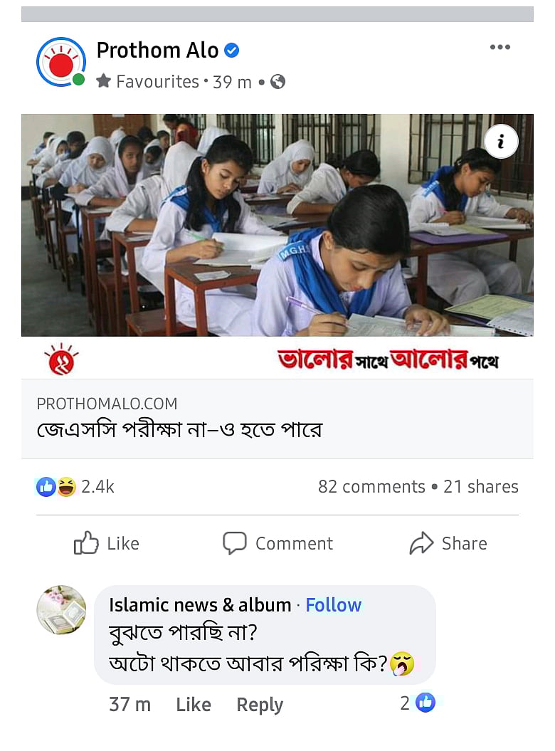 দেশে যে কত রসিক মানুষ আছেন, তা বোঝা যায় প্রথম আলোর ফেসবুক পেজের বিভিন্ন পোস্টের নিচে পাঠকের মন্তব্য দেখলে। কিছু মন্তব্য পড়লে হাসতে হাসতে পেটে খিল লেগে যাওয়ার দশা হয়। প্রিয় পাঠকের সরস এবং তীক্ষ্ণ মন্তব্যগুলো নিয়েই একটু থামুনের এই বিভাগ—পাঠক বলেছেন। এখানে বাছাই করা দারুণ মন্তব্যগুলো প্রকাশ করা হয়। অতএব চোখ রাখুন নিয়মিত...