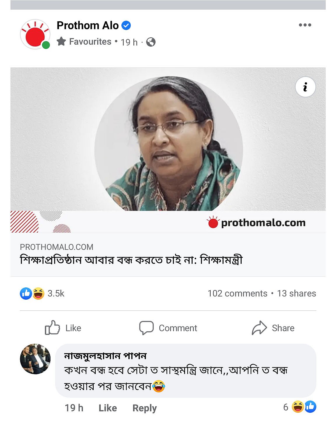দেশে যে কত রসিক মানুষ আছেন, তা বোঝা যায় প্রথম আলোর ফেসবুক পেজের বিভিন্ন পোস্টের নিচে পাঠকের মন্তব্য দেখলে। কিছু মন্তব্য পড়লে হাসতে হাসতে পেটে খিল লেগে যাওয়ার দশা হয়। প্রিয় পাঠকের সরস এবং তীক্ষ্ণ মন্তব্যগুলো নিয়েই একটু থামুনের এই বিভাগ—পাঠক বলেছেন। এখানে বাছাই করা দারুণ মন্তব্যগুলো প্রকাশ করা হয়। অতএব চোখ রাখুন নিয়মিত...