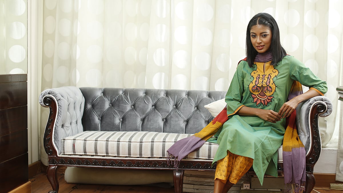 এই কামিজের ছাঁটটা অনেকটাই গাউনের মতো। গরমের কারণে কামিজের ছাঁটে এই ঢিলেঢালা কাটগুলো প্রাধান্য পেয়েছে। পোশাকের উপকরণ সিল্ক। পুরো জমিনে নেই কোনো নকশার বাহুল্য। তবে ওড়না আর চাপা সালোয়ারের রঙের বৈপরীত্যে এনেছে আভিজাত্য।