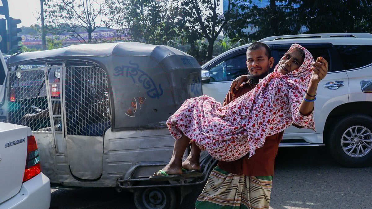 দীর্ঘদিন হৃদ্রোগে ভুগছেন মা। এলাকায় চিকিৎসায় কাজ না হওয়ায় নারায়ণগঞ্জের সোনারগাঁ থেকে মাকে নিয়ে ঢাকাতেই চলে এসেছেন অলিউল্লাহ। কিন্তু মা এতই অসুস্থ যে হাঁটার অবস্থাও তাঁর নেই। কিন্তু হাসপাতালে নিতে হলে তো তাঁকে রাস্তা পার হতে হবে। বাস থেকে নামিয়ে তাই কোলে করে হাসপাতালে নিয়ে যাচ্ছেন ছেলে। আজ বুধবার সকালে সোহরাওয়ার্দী হাসপাতালের সামনে থেকে তোলা ছবি।
