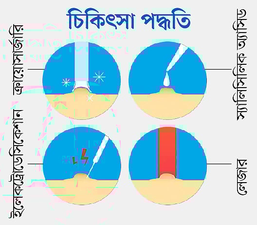 ক্রায়োসার্জারি পদ্ধতিতে তরল নাইট্রোজেন ব্যবহার করা হয়ে থাকে। অস্ত্রোপচারের মাধ্যমে আক্রান্ত কোষকে কেটে অপসারণ করা যায়।