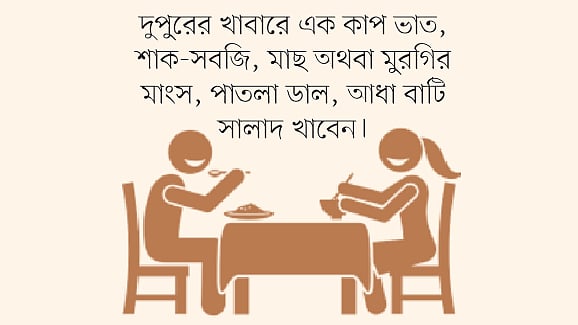 এক কাপ ভাত, শাক-সবজি, মাছ অথবা মুরগির মাংস, পাতলা ডাল, আধা বাটি সালাদ খাবেন। প্রচুর পরিমাণে তাজা শাক-সবজি খেতে হবে। মাছ খেতে পারেন বা কম তেল, মসলা ও সবজি যোগ করে মাংস একটু ঝোল করে রান্না করে খেতে পারেন।