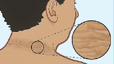 শরীরে নানা ধরনের দাগ পড়ে, যার বেশির ভাগ এমনিতেই চলে যায়। আবার কিছু দাগ আছে, যেগুলো চিকিৎসার প্রয়োজন। কিছু দাগ আবার জটিল কোনো রোগের পূর্বাভাস হিসেবে দেখা হয়। অ্যাকানথোসিস নাইগ্রিক্যানস ত্বকের এমনই একধরনের দাগ। এতে ঘাড়, গলা, বগল, কুঁচকি, হাতের তালু, পায়ের তলার রেখা এবং কখনো কখনো হাতের আঙুলের পেছনের দিক অনেক কালো ও মোটা হয়ে যায়। কারও কারও নাভি, কপালেও এটা দেখা দেয়। কিছু কিছু মানুষের মুখের ভেতরে জিহ্বায় এ দাগের দেখা মেলে। অনেকের আবার হাঁটুর পেছনে, কনুইয়ের সামনের ভাগে, স্তনের নিচে চামড়ার ওপরে, পায়ুপথে হয়ে থাকে।