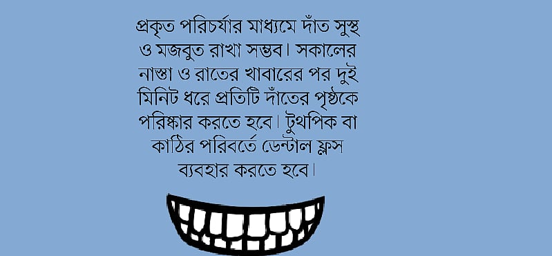 প্রকৃত পরিচর্যার মাধ্যমে দাঁত সুস্থ ও মজবুত রাখা সম্ভব। সকালের নাস্তা ও রাতের খাবারের পর দুই মিনিট ধরে প্রতিটি দাঁতের পৃষ্ঠকে পরিষ্কার করতে হবে। টুথপিক বা কাঠির পরিবর্তে ডেন্টাল ফ্লস ব্যবহার করতে হবে।