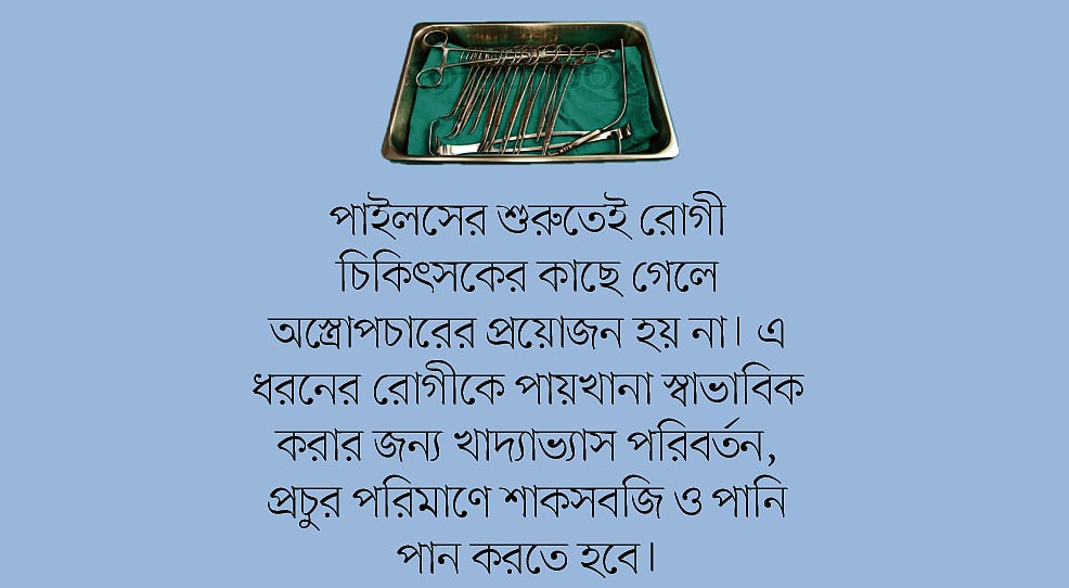 প্রথম ধাপের পাইলসের শুরুতেই রোগী চিকিৎসকের কাছে গেলে অস্ত্রোপচারের প্রয়োজন হয় না। এ ধরনের রোগীকে পায়খানা স্বাভাবিক করার জন্য খাদ্যাভ্যাস পরিবর্তন, প্রচুর পরিমাণে শাকসবজি ও পানি পান করতে হবে।
