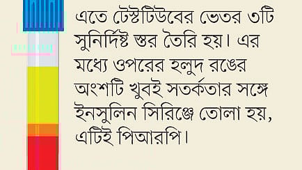 এতে টেস্টটিউবের ভেতর ৩টি সুনির্দিষ্ট স্তর তৈরি হয়। এর মধ্যে ওপরের হলুদ রঙের অংশটি খুবই সতর্কতার সঙ্গে ইনসুলিন সিরিঞ্জে তোলা হয়, এটিই পিআরপি।