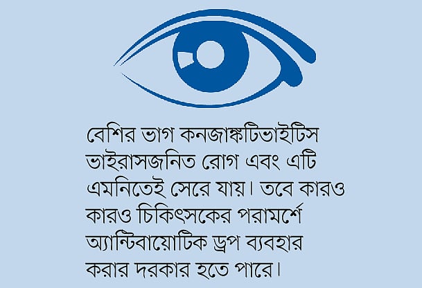 বেশির ভাগ কনজাঙ্কটিভাইটিস ভাইরাসজনিত রোগ এবং এটি এমনিতেই সেরে যায়। তবে কারও কারও চিকিৎসকের পরামর্শে অ্যান্টিবায়োটিক ড্রপ ব্যবহার করার দরকার হতে পারে।