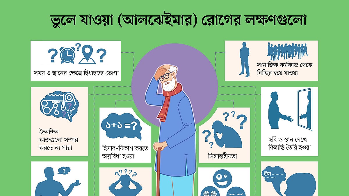 <p>বয়স্কদের মধ্যে কেউ কেউ দৈনন্দিন কাজের অনেক কিছু ভুলে যান। পরিচিত কারও নাম, হাতের কাজ, সিদ্ধান্ত নিতে না পারা—এমন সমস্যা দেখা যায় অনেকের মধ্যে। ভুলে যাওয়ার এই রোগের নাম আলঝেইমার। এই রোগের লক্ষণগুলো দেখা যাক একনজরে। </p>