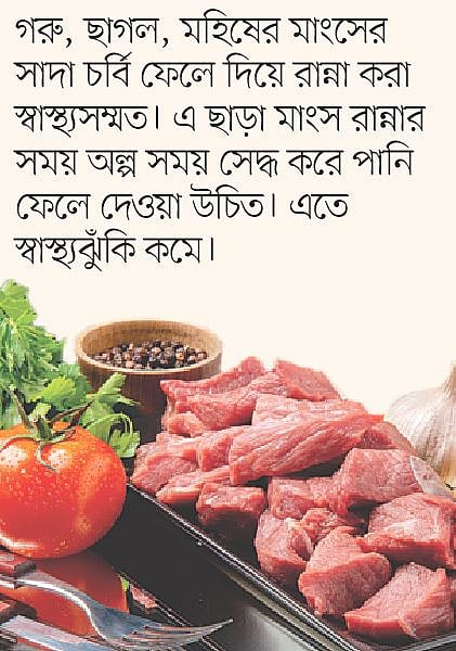 গরু, ছাগল, মহিষের মাংসের সাদা চর্বি ফেলে দিয়ে রান্না করা স্বাস্থ্যসম্মত। এ ছাড়া মাংস রান্নার সময় অল্প সময় সেদ্ধ করে পানি ফেলে দেওয়া উচিত। এতে স্বাস্থ্যঝুঁকি কমে।