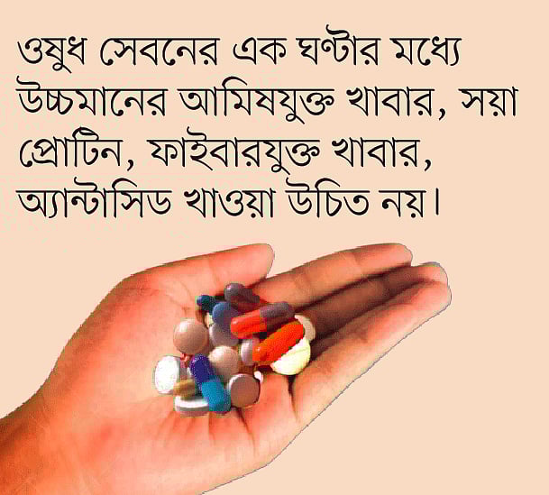 ওষুধ সেবনের এক ঘণ্টার মধ্যে উচ্চমানের আমিষযুক্ত খাবার, সয়া প্রোটিন, ফাইবারযুক্ত খাবার, অ্যান্টাসিড খাওয়া উচিত নয়। ওষুধ সেবনের পরবর্তী চার ঘণ্টার মধ্যে ক্যালসিয়াম বা আয়রন সেবন করাও ঠিক নয়।