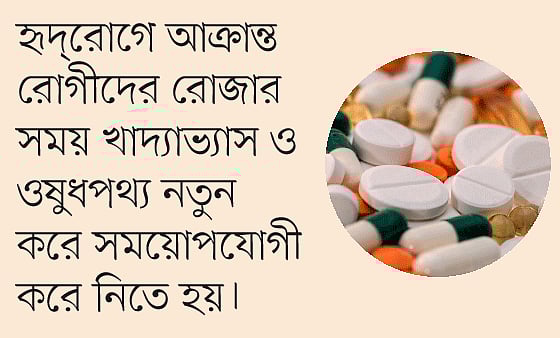 হৃদ্রোগীদের বেশির ভাগ ওষুধ দিনে একবার বা দুবার খেলেই হয়। যেসব ওষুধ দিনে একবার খেলে চলে, রোজার সময় সেগুলো রাতের খাবারের সময় নিলেই চলবে।