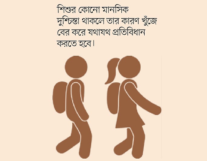 শিশুর কোনো মানসিক দুশ্চিন্তা থাকলে তার কারণ খুঁজে বের করে যথাযথ প্রতিবিধান করতে হবে।