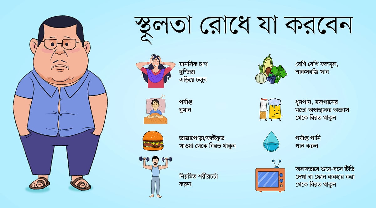 এ সময় কায়িক পরিশ্রম কমে গেছে। ফলে স্থূলতা এখন বিশ্বব্যাপী এক সমস্যাই বটে। স্থূলতা থেকে নানা রকম রোগ হয়ে থাকে। সুস্থ থাকতে স্থূলতা রোধ করতে হবে। আর তা সম্ভব জীবনযাপনে কিছু পরিবর্তন এনে। এখানে একনজরে দেখা নেওয়া যাক স্থূলতা প্রতিরোধে কী করতে হবে।
