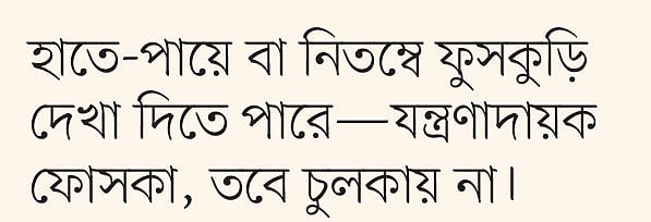 প্রাথমিক উপসর্গ সাধারণ ভাইরাল জ্বরের মতোই। জ্বর শুরুর এক বা দুই দিন পরে মুখের ভেতরে, হাতে-পায়ে বা নিতম্বে ফুসকুড়ি দেখা দিতে পারে—যন্ত্রণাদায়ক ফোসকা, তবে চুলকায় না। শিশুর ত্বকের রঙের ওপর নির্ভর করে ফুসকুড়ি লাল, সাদা, ধূসর বা ছোট ছোট দাগের মতো দেখা যেতে পারে। ফুসকুড়ি সাধারণত জ্বর হওয়ার তিন থেকে পাঁচ দিন পর দেখা যায়।