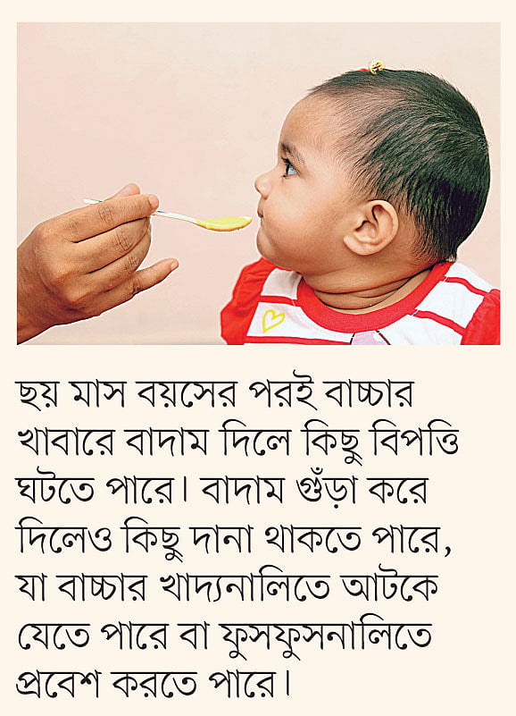 ছয় মাস বয়সের পরই বাচ্চার খাবারে বাদাম দিলে কিছু বিপত্তি ঘটতে পারে। বাদাম গুঁড়া করে দিলেও কিছু দানা থাকতে পারে, যা বাচ্চার খাদ্যনালিতে আটকে যেতে পারে বা দুর্ঘটনাবশত ফুসফুসনালিতে প্রবেশ করতে পারে। তাই বাচ্চা যখন খাবার ভালোমতো চিবিয়ে খাওয়া শিখবে, তখন আপনি স্ন্যাক্স হিসেবে দিনে একবার বাদাম খাওয়াতে পারেন। বাদাম চিবিয়ে খেলে বাচ্চা বাদাম থেকে পরিপূর্ণ পুষ্টি পাবে।