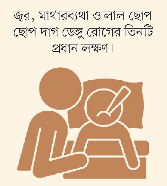 ডেঙ্গু হলে জ্বর, মাথার ব্যথা, গা-হাত-পা ব্যথা, অস্থি সন্ধিতে ব্যথা, চোখের পেছন দিকে ব্যথা, পিঠে ব্যথা হতে পারে।