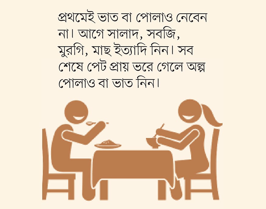 প্রথমেই ভাত বা পোলাও নেবেন না। আগে সালাদ, সবজি, মুরগি, মাছ ইত্যাদি নিন। সব শেষে পেট প্রায় ভরে গেলে অল্প পোলাও বা ভাত নিন।