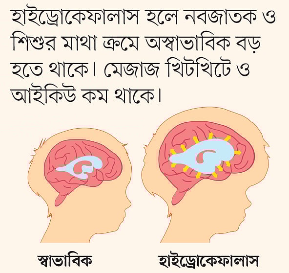 মস্তিষ্কে বা ব্রেনে পানি জমা ও এর কারণে মাথা বড় হওয়াকে ইংরেজিতে বলে হাইড্রোকেফালাস। আমাদের মস্তিষ্কের গভীরে ভেন্ট্রিকল নামে এক ধরনের শূন্যস্থান আছে। যেখান থেকে সিএসএফ বা সেরিব্রোস্পাইনাল ফ্লুইড নামের তরল পদার্থ তৈরি হয়। এক দিকে এই তরল মস্তিষ্কের ভেতর তৈরি হয়, অন্য দিকে তা রক্তে শোধিত ও নিষ্কাশিত হয়। এটি একটি চলমান প্রক্রিয়া।