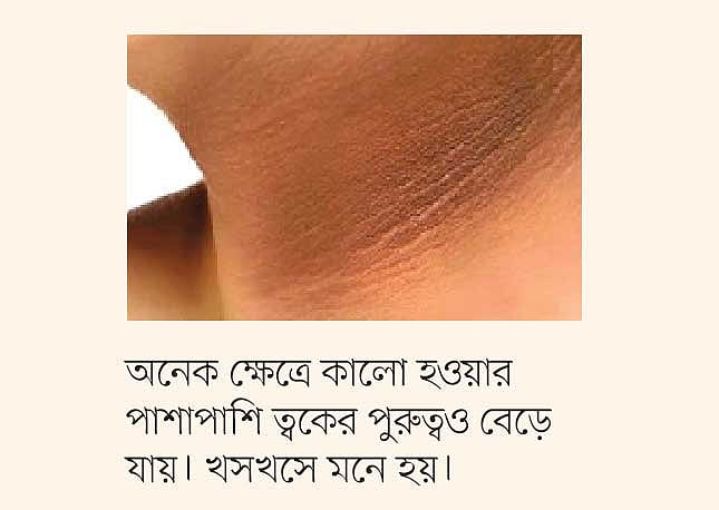 অনেক ক্ষেত্রে কালো হওয়ার পাশাপাশি ত্বকের পুরুত্বও বেড়ে যায়। খসখসে মনে হয়। পরে ত্বকে ভাঁজ দেখা দেয় এবং চুলকানির সৃষ্টি হয়। অনেক সময় ত্বক জ্বলতে থাকে। কখনো কখনো ঘামে দুর্গন্ধ হয়। চল্লিশোর্ধ্ব নারীদের ৮০ শতাংশই এ সমস্যায় ভুগতে পারেন।