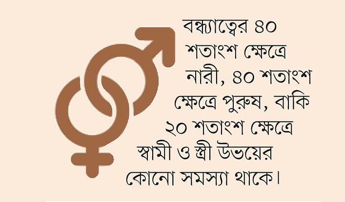 বন্ধ্যাত্বের ৪০ শতাংশ ক্ষেত্রে নারী, ৪০ শতাংশ ক্ষেত্রে পুরুষ, বাকি ২০ শতাংশ ক্ষেত্রে স্বামী ও স্ত্রী উভয়ের কোনো সমস্যা থাকে।