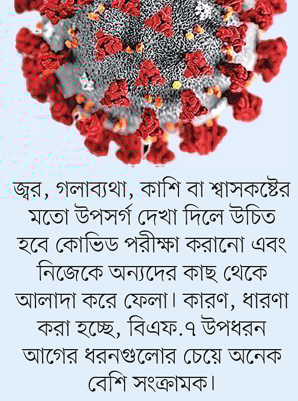 জ্বর, গলাব্যথা, কাশি বা শ্বাসকষ্টের মতো উপসর্গ দেখা দিলে উচিত হবে কোভিড পরীক্ষা করানো এবং নিজেকে অন্যদের কাছ থেকে আলাদা করে ফেলা। কারণ, ধারণা করা হচ্ছে, বিএফ.৭ উপধরন আগের ধরনগুলোর চেয়ে অনেক বেশি সংক্রামক।