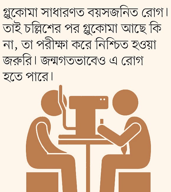 গ্লুকোমা সাধারণত বয়সজনিত রোগ। তাই চল্লিশের পর গ্লুকোমা আছে কি না, তা পরীক্ষা করে নিশ্চিত হওয়া জরুরি। চোখের চাপ, স্নায়ুরজ্জুর অবস্থা ও দৃষ্টির পরিসীমা পরীক্ষা করে খুব সহজেই গ্লুকোমা নির্ণয় করা যায়। কখনো কখনো জন্মগতভাবেও এ রোগ হতে পারে। সে ক্ষেত্রে জন্মের পর শিশুর চোখ থেকে পানি পড়া, আলোর প্রতি সংবেদনশীলতা, অস্বচ্ছ মণি ও অক্ষিগোলক বড় হতে থাকা—এসব লক্ষণ দেখামাত্র শিশুর চোখ গ্লুকোমায় আক্রান্ত কি না, তা পরীক্ষা করিয়ে নিতে হবে।