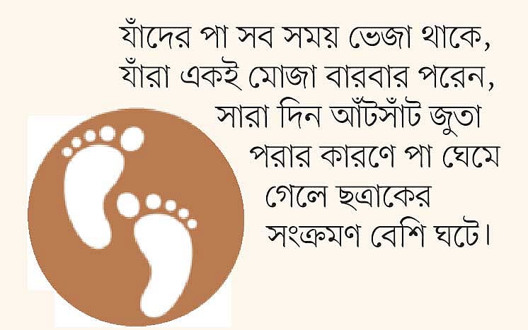 পা সব সময় ভেজা থাকা, একই মোজা বারবার পরা, সারা দিন আঁটসাঁট জুতা পরার কারণে পা ঘেমে গেলে ছত্রাকের সংক্রমণ বেশি ঘটে।