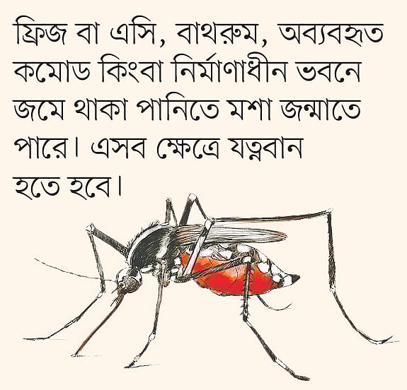 কোথাও তিন দিনের বেশি সময় পানি জমে থাকতে দেওয়া যাবে না। টব, টায়ার, ডাবের খোসা, এমনকি খানাখন্দে পানি জমতে পারে। ফ্রিজ বা এসি, বাথরুম, অব্যবহৃত কমোড কিংবা নির্মাণাধীন ভবনে জমে থাকা পানিতে মশা জন্মাতে পারে। এসব ক্ষেত্রে যত্নবান হতে হবে। প্রতিবেশীর বাড়িতে এমন কিছু দেখলে তাঁকেও বলতে হবে।