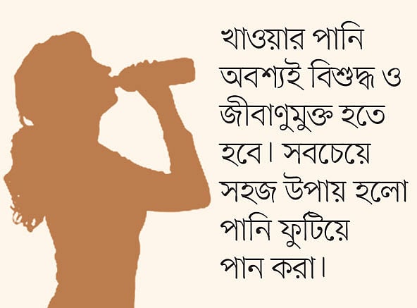 খাওয়ার পানি অবশ্যই বিশুদ্ধ ও জীবাণুমুক্ত হতে হবে। সবচেয়ে সহজ উপায় হলো পানি ফুটিয়ে পান করা। এ ছাড়া ফিটকিরি ও পানি বিশুদ্ধকরণ বড়ি ব্যবহার করা যেতে পারে। বন্যাকবলিত এলাকায় রান্নার খাবার, বাসনকোসন, হাঁড়ি-পাতিল বিশুদ্ধ পানিতে ধুতে হবে।