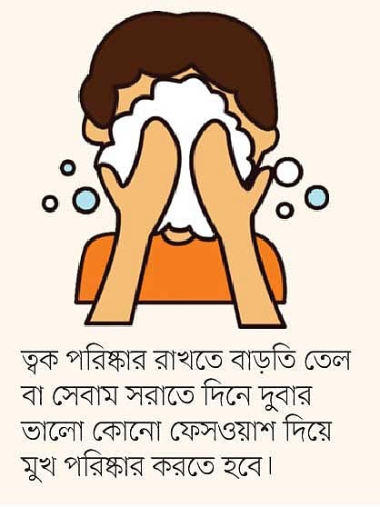 ত্বক পরিষ্কার রাখতে বাড়তি তেল বা সেবাম সরাতে দিনে দুবার ভালো কোনো ফেসওয়াশ দিয়ে মুখ পরিষ্কার করতে হবে। নন–ফোমিং, অ্যালকোহল ফ্রি, পিএইচ ব্যালান্সড ফেসওয়াশ বেছে নিন।