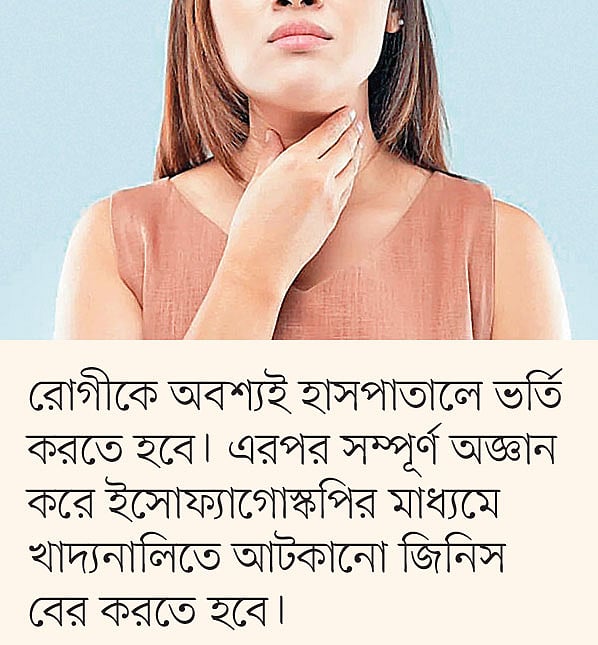 কী কী ধরনের বস্তু সাধারণত গলায় আটকায়? ধাতব মুদ্রা বা পয়সা, খেলনার ছোট ছোট অংশ, বাঁধানো দাঁত, মাছের কাঁটা, মাংসের ছোট হাড়, সুই, সেফটিপিন—এমন আরও অনেক কিছু। গলবিল ও খাদ্যনালির সংযুক্ত স্থান হলো খাদ্যনালির সবচেয়ে সংকীর্ণ জায়গা। এখানেই বেশির ভাগ জিনিস আটকায়। এ ছাড়া খাদ্যনালির চারটি সংকুচিত স্থানে যেকোনো কিছু আটকাতে পারে।