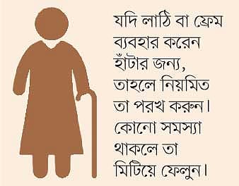 যদি লাঠি বা ফ্রেম ব্যবহার করেন হাঁটার জন্য, তাহলে নিয়মিত তা পরখ করুন। কোনো সমস্যা থাকলে তা মিটিয়ে ফেলুন।