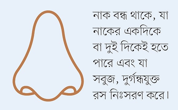• নাক বন্ধ থাকে, যা নাকের একদিকে বা দুই দিকেই হতে পারে এবং যা সবুজ, দুর্গন্ধযুক্ত রস নিঃসরণ করে।