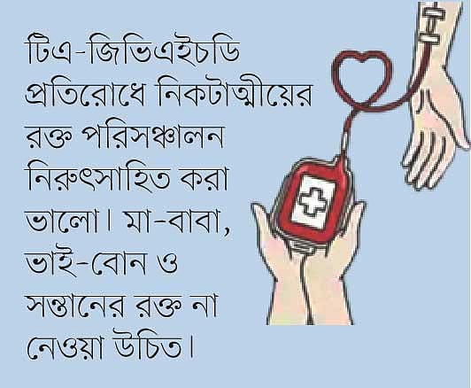 টিএ-জিভিএইচডি প্রতিরোধে নিকটাত্মীয়ের রক্ত পরিসঞ্চালন নিরুৎসাহিত করা ভালো। মা–বাবা, ভাই–বোন ও সন্তানের রক্ত না নেওয়া উচিত। এ ছাড়া নিকটাত্মীয় বা ফার্স্ট ডিগ্রি রিলেটিভ; যেমন আপন চাচা, ফুপু, খালা ও মামার রক্তও না নেওয়া ভালো।