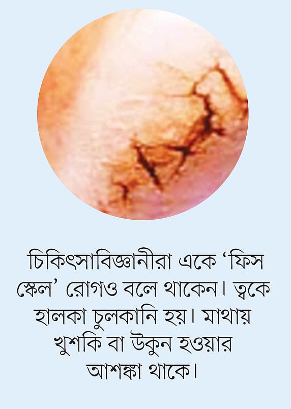 আক্রান্ত স্থান মাছের শরীরের মতো, লম্বা দাগ ও চিরল ও সূক্ষ্ম লাইনের মতো মনে হয়। এ কারণে চিকিৎসাবিজ্ঞানীরা একে ‘ফিস স্কেল’ রোগও বলে থাকেন। ত্বকে হালকা চুলকানি হয়। মাথায় খুশকি বা উকুন হওয়ার আশঙ্কা থাকে।