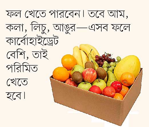 ফল খেতে পারবেন। তবে আম, কলা, লিচু, আঙুর—এসব ফলে কার্বোহাইড্রেট বেশি, তাই পরিমিত খেতে হবে।