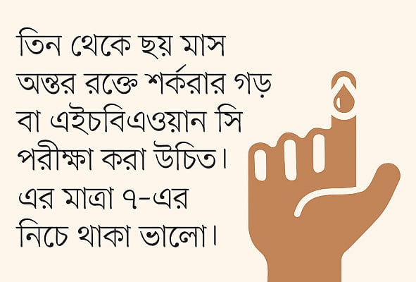 এক. তিন থেকে ছয় মাস অন্তর রক্তে শর্করার গড় বা এইচবিএওয়ান সি পরীক্ষা করা উচিত। এর মাত্রা ৭–এর নিচে থাকা ভালো। তা না হলে বুঝতে হবে, শর্করা নিয়ন্ত্রণে নেই এবং হয়তো চিকিৎসাপদ্ধতি পরিবর্তন করতে হবে। এর সঙ্গে ফলোআপে রক্তচাপ মাপতে হবে। বছরে একবার রক্তে ক্ষতিকর চর্বি পরিমাপ করা উচিত। সেই সঙ্গে দরকার ওজন পরিমাপ করা এবং বিএমআই হিসাব করা। তবে এটাই যথেষ্ট নয়। রোগী নিজে বাড়িতে সপ্তাহে এক দিন বা দুই দিন নিজের শর্করা পরীক্ষা করবেন। খালি পেটে এবং খাওয়ার দুই ঘণ্টা পর। এই পরিমাপ চার্ট করে রাখবেন। খালি পেটে সুগার ৬ মিলিমোল বা এর কম এবং খাওয়ার ২ ঘণ্টা পর ৮ মিলিমোল বা এর কম থাকা বাঞ্ছনীয়।