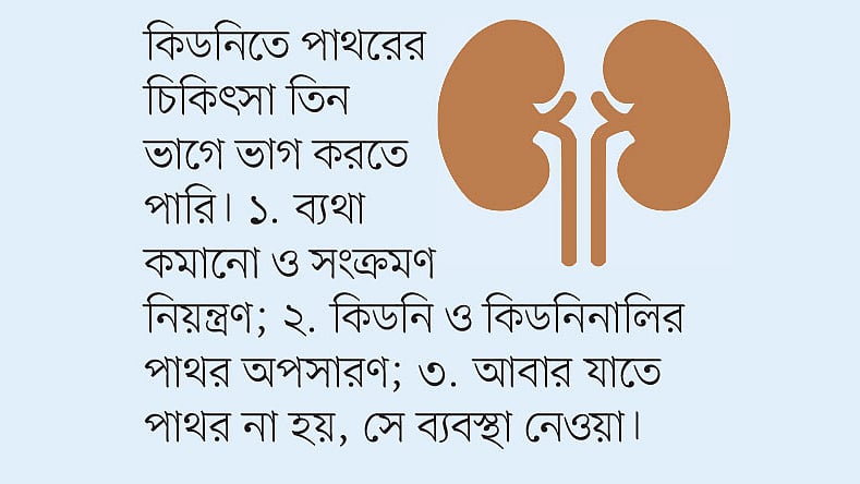 কিডনিতে পাথরের চিকিৎসা তিন ভাগে ভাগ করতে পারি। ১. ব্যথা কমানো ও সংক্রমণ নিয়ন্ত্রণ; ২. কিডনি ও কিডনিনালির পাথর অপসারণ; ৩. আবার যাতে পাথর না হয়, সে ব্যবস্থা নেওয়া।