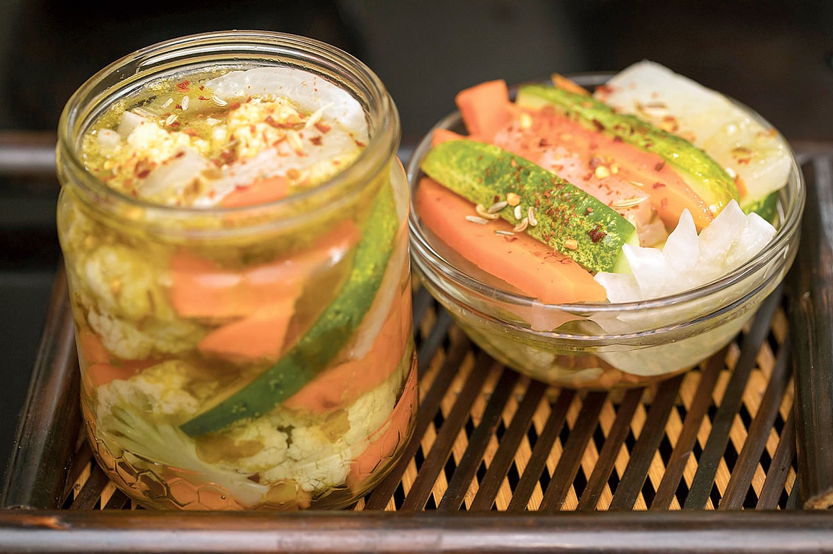 প্রণালি: ভিনেগার, লবণ, চিনি জলপাই তেল একসঙ্গে চুলায় দিন। ফুটে উঠলে চুলা থেকে নামিয়ে আপেল সিডার ভিনেগার, রোজমেরি, অরিগানো মিশিয়ে রাখতে হবে। গাজর, মুলা ও ফুলকপি আলাদাভাবে লবণপানিতে ভিনেগার দিয়ে আধা সেদ্ধ করে ঠান্ডা করে নিন। বড় কাচের বয়ামে সব সবজি, রসুন, কাঁচা মরিচ ও আদা পর্যায়ক্রমে সাজিয়ে মিশ্রিত ভিনেগার ঢেলে বয়ামের মুখ ভালোমতো আটকে ৭-৮ দিন রোদে দিতে হবে।