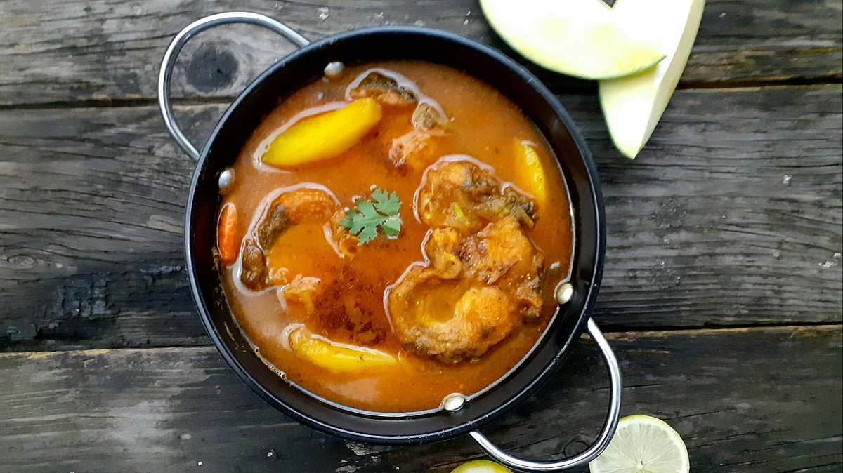 সামান্য হলুদ, মরিচগুঁড়া ও লবণ মাছের সঙ্গে মাখিয়ে নিন। প্যানে পরিমাণমতো তেল ভালোভাবে গরম করে মাছগুলো ভেজে নিন। এবার অন্য কড়াইয়ে পরিমাণমতো তেল দিয়ে পেঁয়াজবাটা, জিরাবাটা দিয়ে নেড়ে দিন। এবার বাকি সব মসলা, লবণ, চিনি ও সামান্য পানি দিয়ে মসলা কষিয়ে নিন। মসলা কষানো হলে পরিমাণমতো পানি দিন। ফুটে উঠলে মাছ, কাঁচা মরিচ ও আমের টুকরাগুলো দিয়ে ঢেকে দিন। ঝোল রেখে নামিয়ে নিন। এবার ওপরে জিরাগুঁড়া ও ধনেপাতা ছড়িয়ে পরিবেশন করুন।