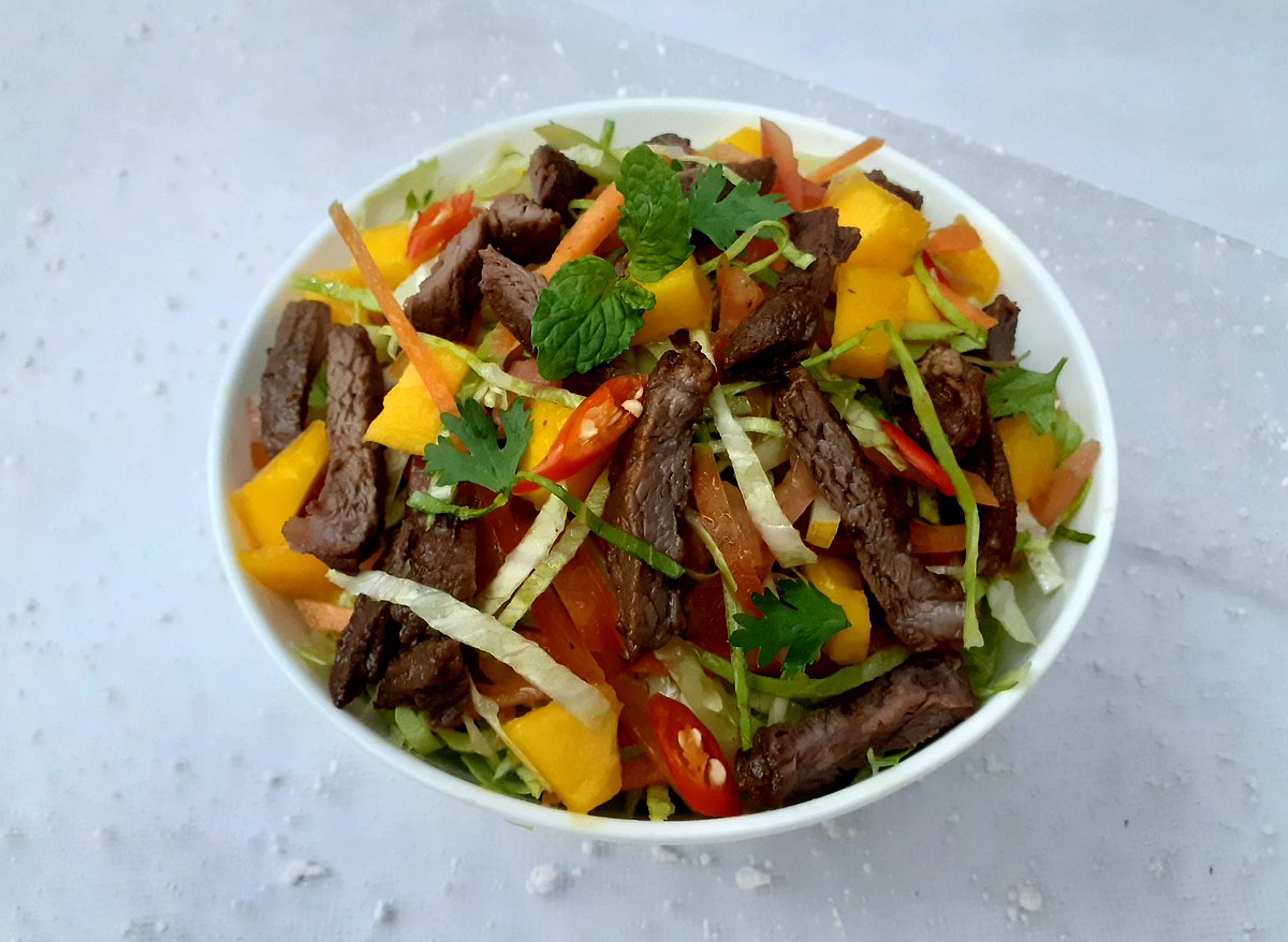 গরুর মাংস লম্বা স্লাইস ২ কাপ, আদা–রসুন বাটা ১ চা-চামচ, সয়া সস ১ টেবিল চামচ, গোলমরিচের গুঁড়া আধা চা-চামচ, লবণ স্বাদমতো, মাখন ২ টেবিল চামচ, শক্ত পাকা আম লম্বা করে কাটা ১ কাপ, টমেটো লম্বা করে কাটা আধা কাপ, শসা লম্বা করে কাটা আধা কাপ, কাঁচা মরিচের কুচি ৩-৪টি।