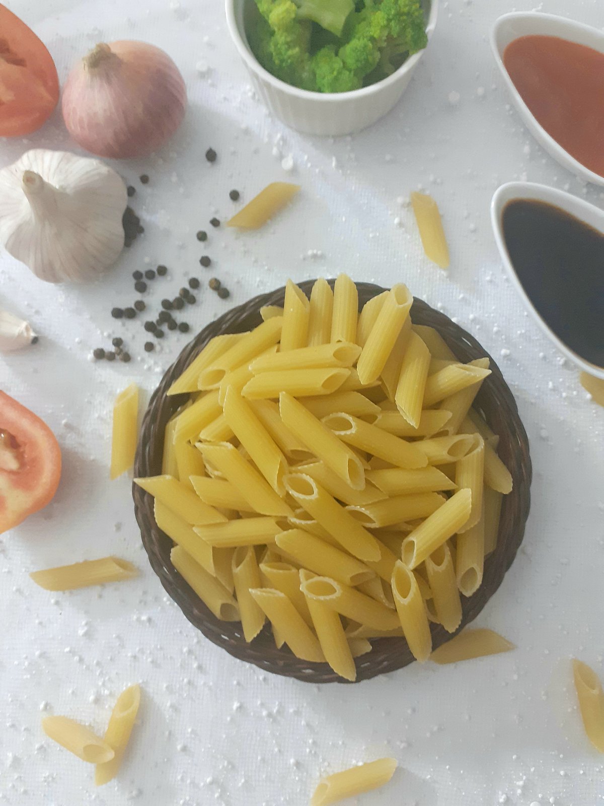 পাস্তা ২ কাপ, রসুনকুচি ১ টেবিল চামচ, টমেটো কিউব ১ কাপ, সয়া সস ১ টেবিল চামচ, লবণ স্বাদমতো, পেঁয়াজকুচি ১ টেবিল চামচ, টমেটো সস ১/৪ কাপ, মাখন ২ টেবিল চামচ, গোলমরিচগুঁড়া আধা চা–চামচ, ব্রোকলি ১ কাপ।
