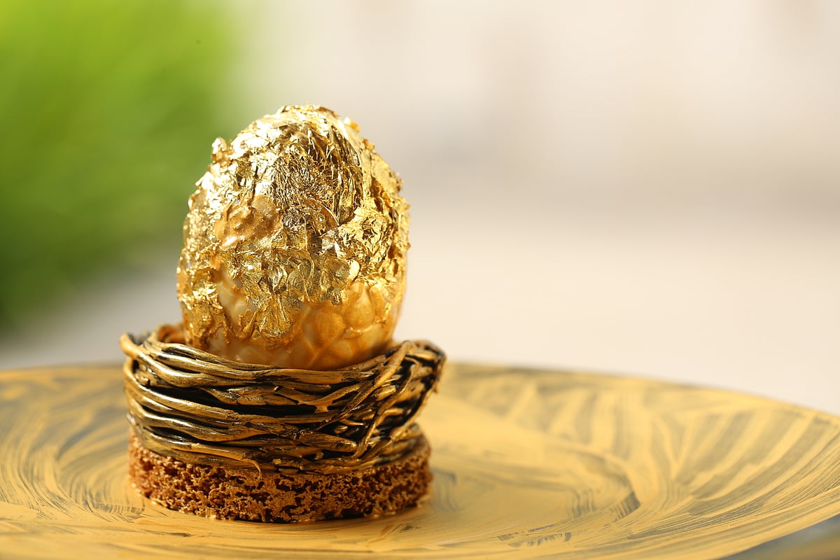 প্রণালি: প্রথমে সাদা চকলেট গলিয়ে সেটা দিয়ে ডিমের খোসা তৈরি করুন। এবার ভেতরের মিশ্রণটি তৈরি করুন। ডিমের কুসুম ও চিনি একটি বোলে নিয়ে ডবল বয়লারে ফেটে সাদা ক্রিমের মতো বানান। এরপর তার সঙ্গে জেলাটিন দিন। আস্তে আস্তে ক্রিম চিজ ও হুইপ ক্রিম মিশিয়ে চিজ কেকের মিশ্রণ তৈরি করুন। এবার এটাকে চকলেট দিয়ে বানানো ডিমের খোলসের ভেতরে ঢেলে দিন। মিশ্রণটির সঙ্গে আমের জুস ও রং মিশিয়ে কুসুম তৈরি করে মাঝখানে বসিয়ে দিন। পরে চকলেট দিয়ে তৈরি ডিমের খোসা দুটি জোড়া লাগিয়ে ডিম তৈরি করে নিন। ওপরে সোনালি পেপার মুড়িয়ে দিন।