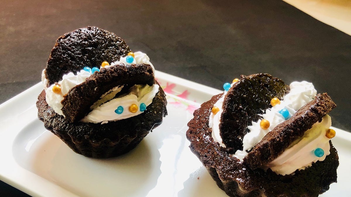 প্রণালি: দুধ ও লেবুর রস মিশিয়ে ঢেকে রাখুন। ময়দা, কোকো পাউডার, বেকিং পাউডার একসঙ্গে চেলে নিন। ডিমের সঙ্গে ভ্যানিলা এসেন্স, বাটার মিল্ক (দুধের মিশ্রণ), মাখন একসঙ্গে ডিমের বিটার অথবা হুইস্ক দিয়ে ভালোভাবে মিশিয়ে নিন। এবার ময়দার মিশ্রণ অল্প অল্প করে মিলিয়ে কেকের মিশ্রণ তৈরি করুন। কাপ ডাইসে ঢেলে ১৬০ ডিগ্রি প্রিহিট তাপে ওভেনে ২৫ মিনিট বেক করুন। ঠান্ডা হলে ভেতরের অংশ গোল করে নিন। এবার ভেতরে ক্রিম দিন। কাটা অংশ দুই টুকরা করে প্রজাপতির মতো করে বসিয়ে দিন।